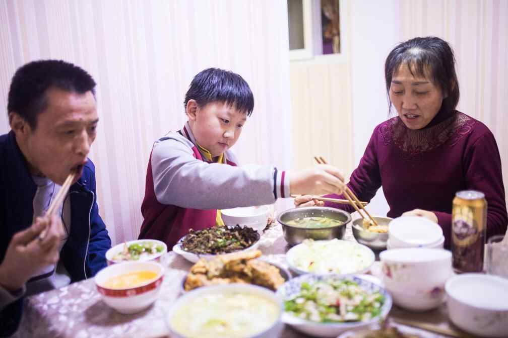 ↑2019年12月20日,重庆市渝中区,冉光辉一家人在家中吃晚饭。