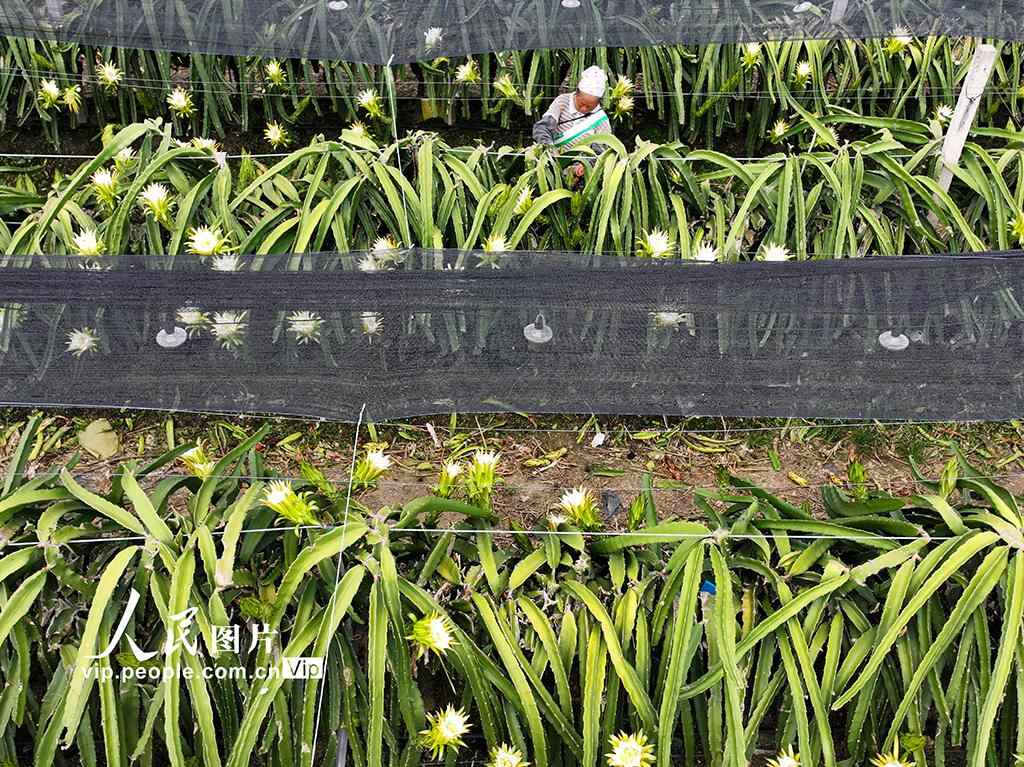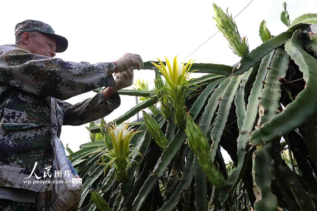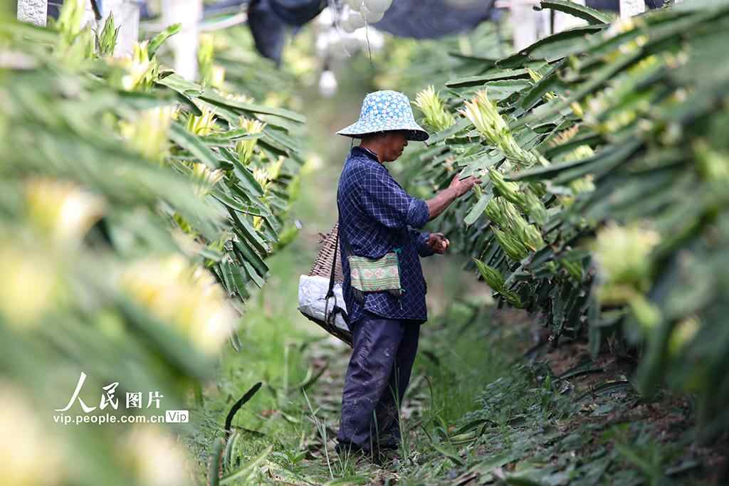 2025年6月15日,云南省西双版纳傣族自治州景洪市勐罕镇一处火龙果种植基地,工人在进行花期管护。
