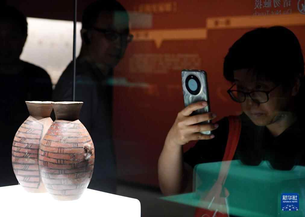6月14日,参观者在大河村遗址博物馆新馆内拍摄展品彩陶双连壶。