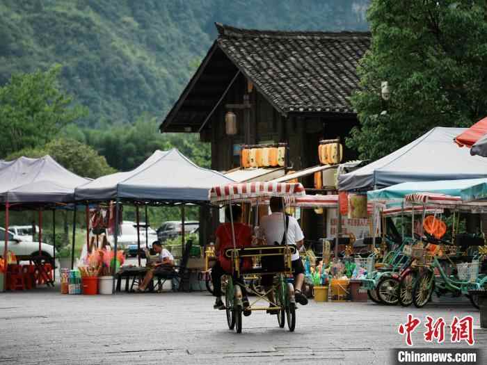 6月15日,游客在贵州省江口县云舍村骑车游玩。中新社记者 周燕玲 摄