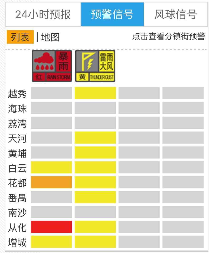 截至16日12时47分,广州多区发布暴雨及雷雨大风预警信号。白云、花都、从化、增城,发布暴雨黄色或以上级别预警信号,其中从化发布暴雨红色预警信号,花都发布暴雨橙色预警信号。除海珠、荔湾、南沙外,广州其余各区均已发布雷雨大风黄色预警信号。随着雨势发展,不排除广州各区后续继续发布或调整预警信号,请市民做好防御工作。