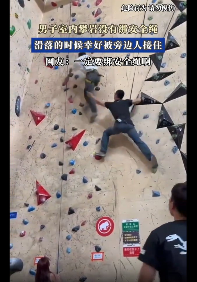 6月15日,广东。小伙室内攀岩脱力,坠下时众人才发现没带安全绳,同在岩壁上大哥臂力惊人单手将其抱住。安全提示:无安全绳攀岩是对所有人的不负责。