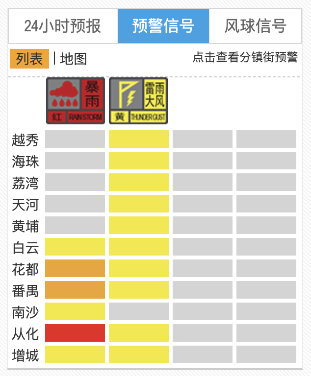 截至6月16日13时20分,广州市除南沙区外,其余各区均已发布雷雨大风黄色预警信号。从化发布暴雨红色预警信号,花都、番禺发布暴雨橙色预警信号,白云、南沙、增城发布暴雨黄色预警信号。由于雨势仍在发展,不排除广州各区后续继续发布或调整预警信号,请市民做好防御工作。