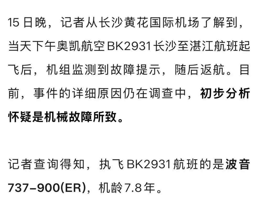 6月15日,网传奥凯航空BK2931长沙飞至湛江航班因一侧发动机失效,起飞后返航至起飞机场。
