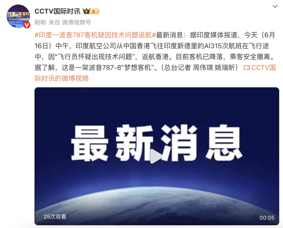 据央视新闻,当地时间6月16日,因飞机疑似出现技术故障,印度航空由中国香港飞往印度新德里的一架航班折返香港。目前,该客机已安全降落香港国际机场,乘客安全撤离。