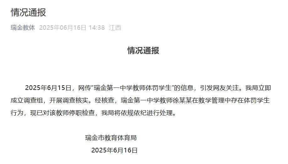 2025年6月15日,网传“瑞金第一中学教师体罚学生”的信息,引发网友关注。我局立即成立调查组,开展调查核实。
