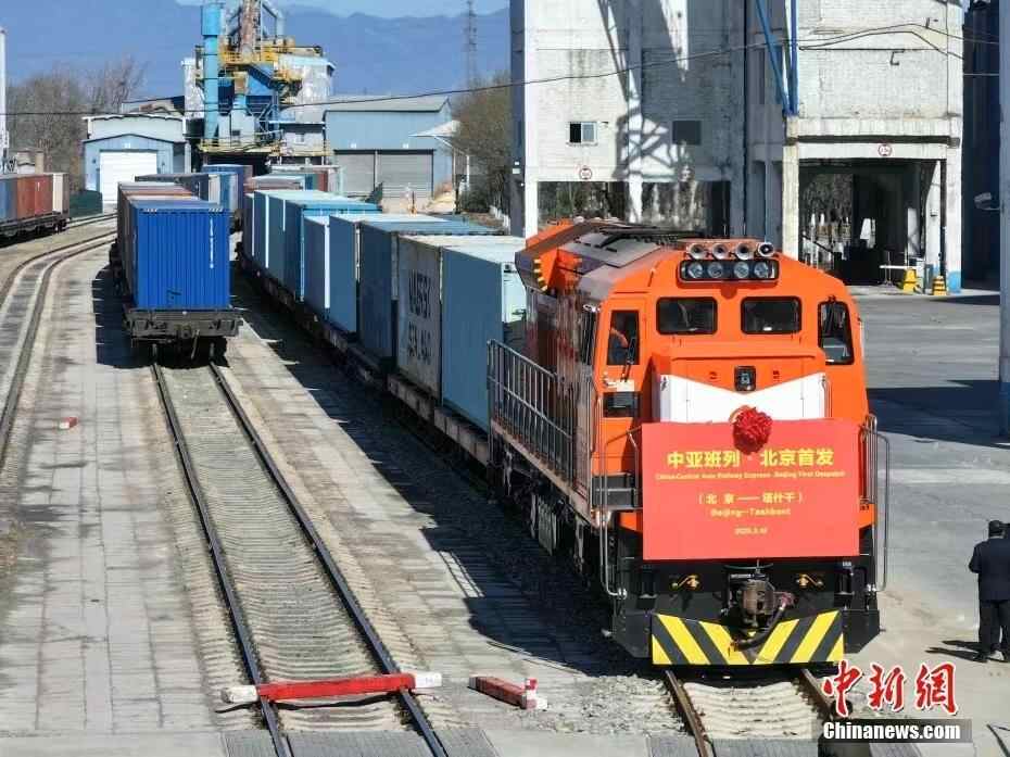 资料图:2025年3月19日,首趟北京开往塔什干的中亚班列从中国铁路北京局北京铁路物流中心琉璃河营业网点专用线驶出。中新社发 国铁北京局供图