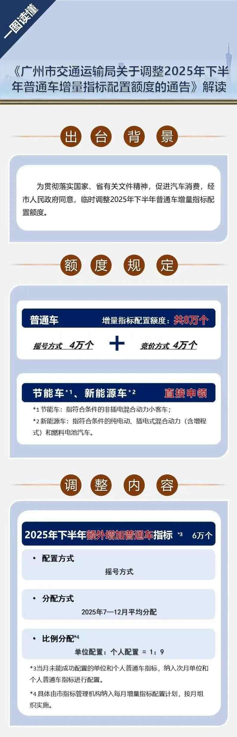 据了解,本次调整下半年普通车增量指标配置额度,是贯彻落实国家、广东省关于提振消费专项行动方案相关要求的具体举措,进一步促进广州汽车消费。相关措施实施后,2025年下半年普通车增量指标增加6万个。