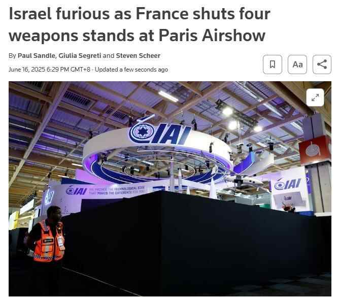 中新网援引路透社16日报道,法国关闭了巴黎航展上的四个以色列公司展位,以色列回应称:对此感到愤怒。