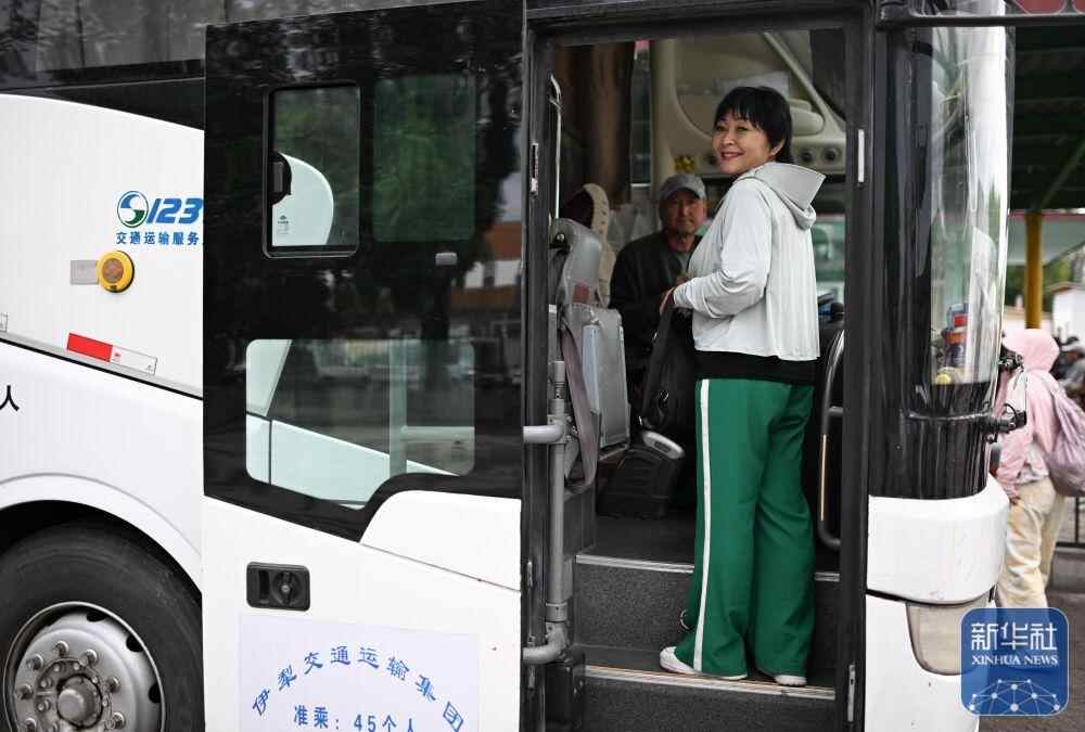 清晨,“摆渡人”高云在哈萨克斯坦扎尔肯特镇汽车站登上跨国客运大巴,准备返回中国(5月24日摄)。