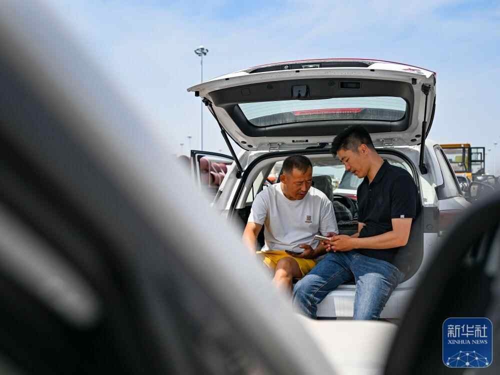 在新疆霍尔果斯一家汽车贸易公司,外国客商在室外仓库了解情况(6月10日摄)。