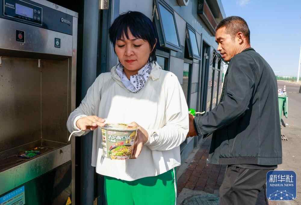 在新疆霍尔果斯公路口岸,高云(前)在等待验放时冲泡方便面(5月29日摄)。霍尔果斯出入境边防检查站在等待区域设置公共卫生间与开水间,为商品车“摆渡人”提供保障。