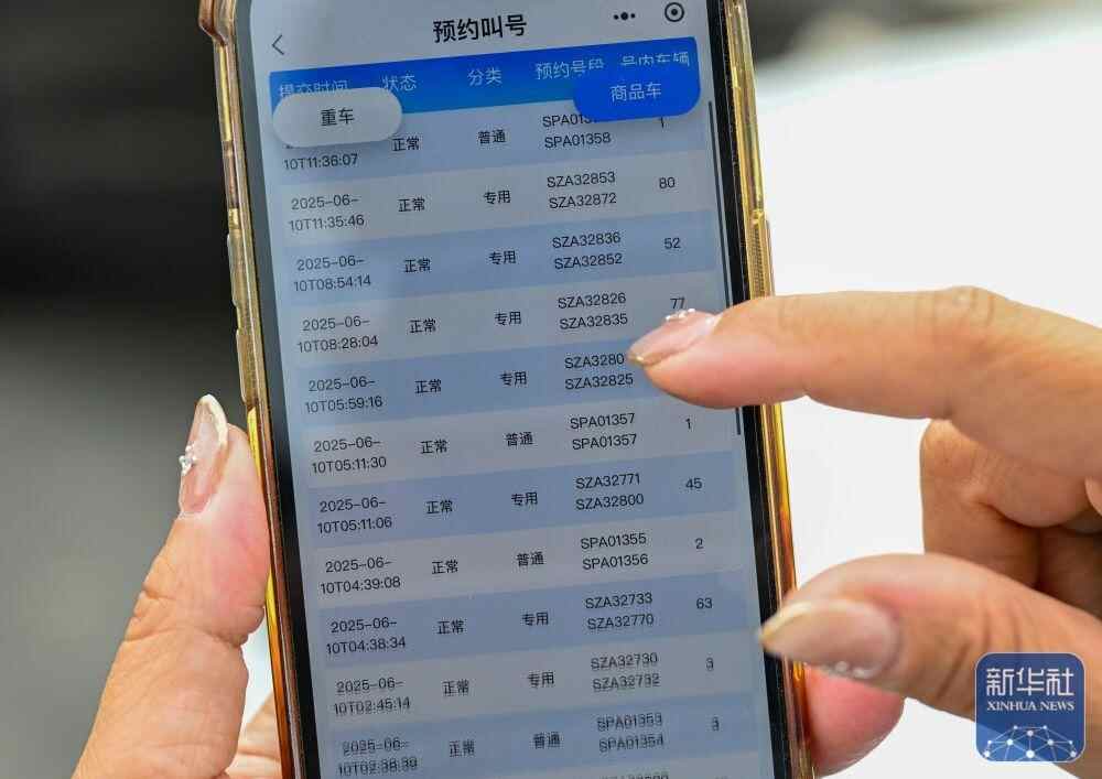 一名“摆渡人”通过“霍尔果斯经济开发区口岸管理局”小程序,查看商品车出口预约叫号情况(6月10日摄)。