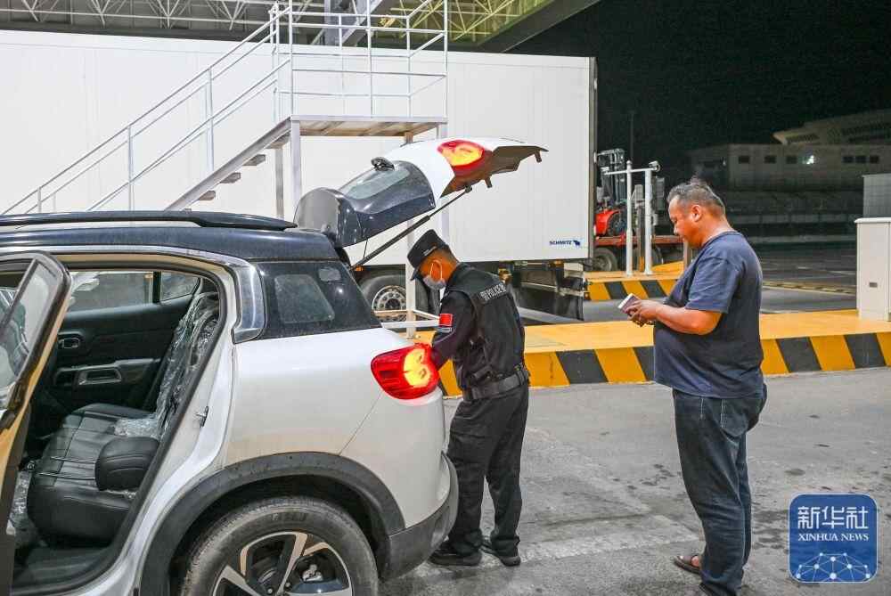 凌晨,在新疆霍尔果斯公路口岸货运执勤现场,霍尔果斯边防检查站移民管理警察查验由“摆渡人”运送出国的车辆(6月11日摄)。
