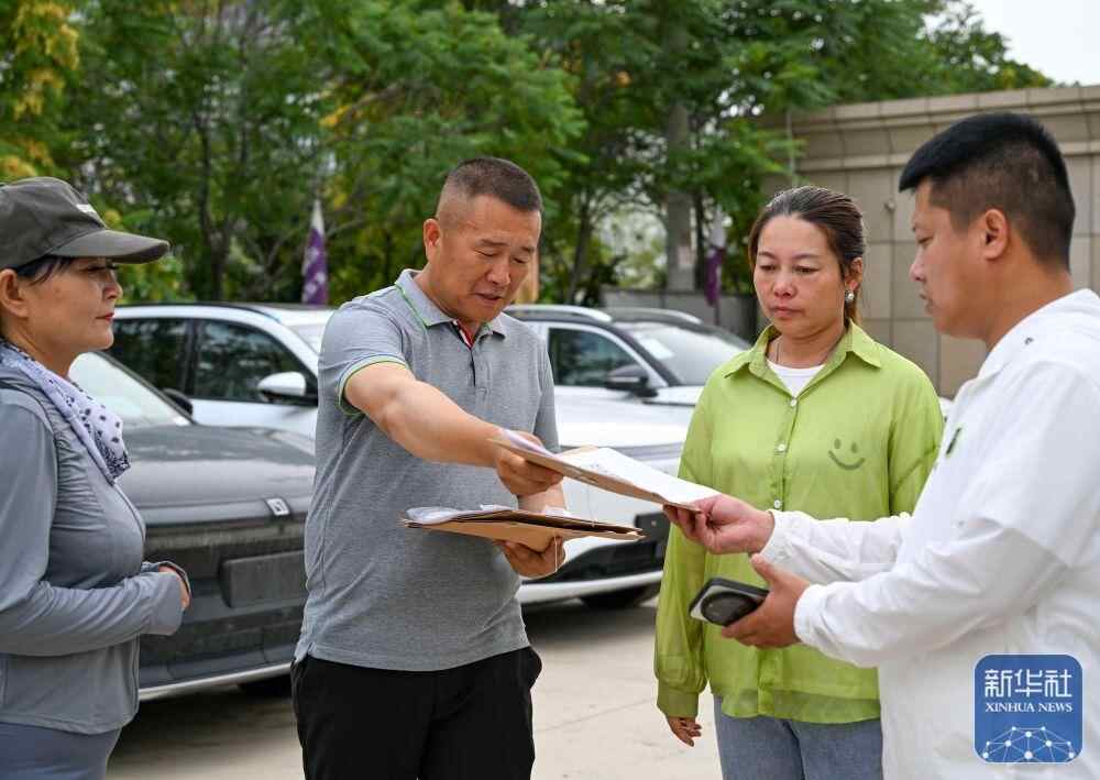 在新疆霍尔果斯一家汽车贸易公司,公司负责人(左二)向“摆渡人”发放车钥匙和出关所需资料(6月10日摄)。