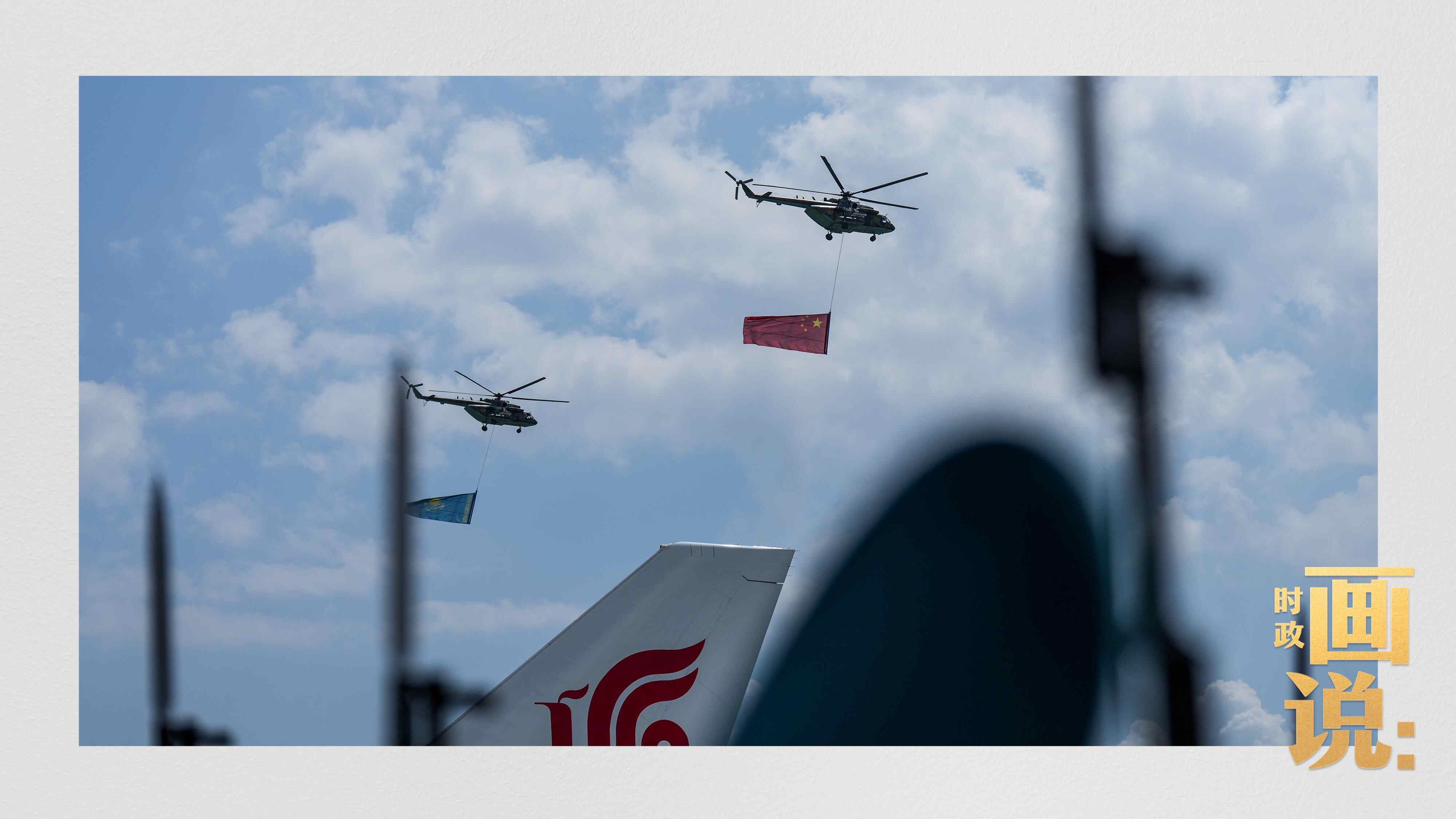 两架米-8直升机分别悬挂中、哈国旗飞过机场上空以示欢迎。