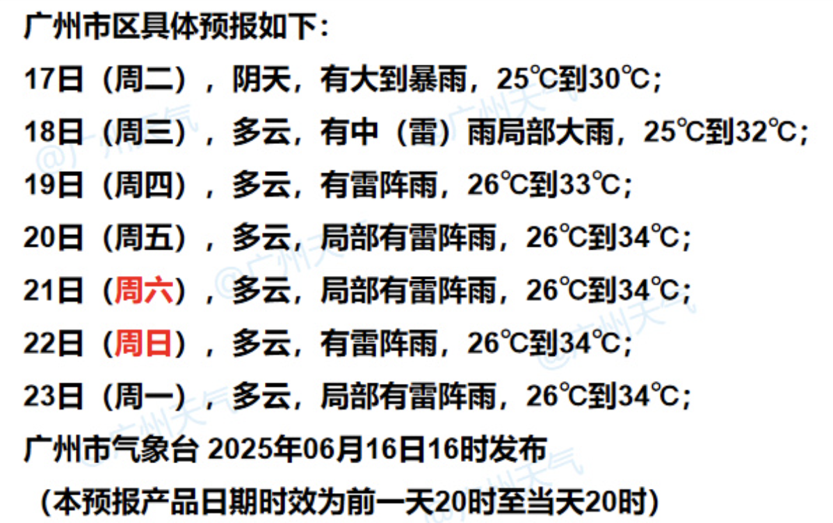广州市气象台预计,17日广州继续受高空槽和西南季风影响,仍有大到暴雨局部大暴雨,18日起随着副热带高压加强控制,渐转多云伴雷雨天气,最高气温逐日上升;预计18日至23日,广州市区最高气温将逐渐从32℃升至34℃。
