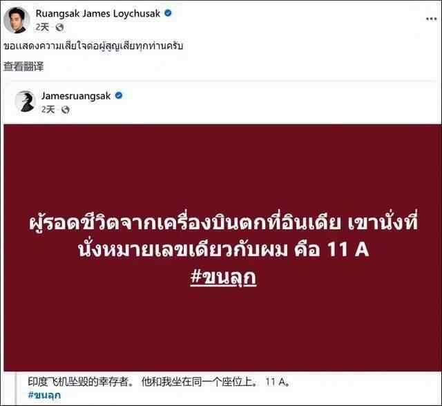 近日,泰国著名歌手詹姆斯(James Ruangsak Loychusak)在社交媒体发文,称对印度航空坠机事件中唯一幸存者所坐的座位号深感震惊,因为这正是他在27年前空难中所坐的位置——11A。