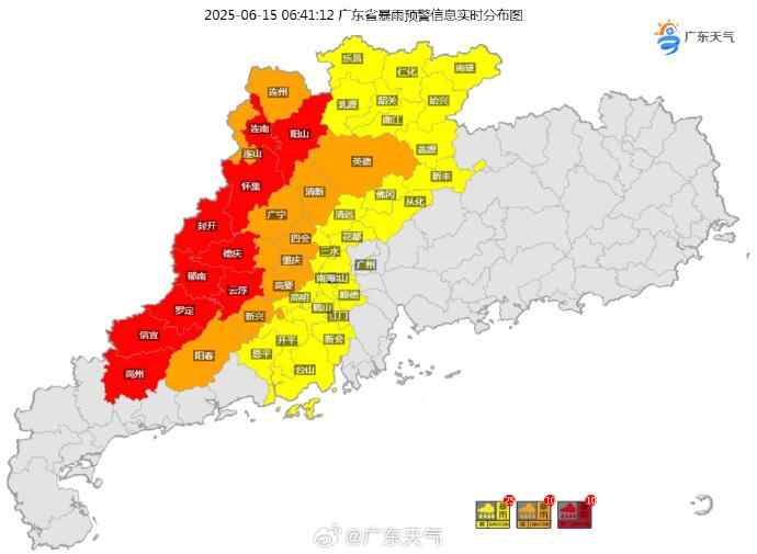 据@广东天气消息,截至6月15日6时41分,高州、信宜、罗定、郁南、云浮、德庆、封开、怀集、连南、阳山暴雨红色预警信号生效中,强降水范围逐渐往东扩展,降水持续时间较长。暴雨期间尽量不要外出,山区小河小溪易暴涨,桥面过水不可通行,水边居民密切关注,发现异常及时撤离。
