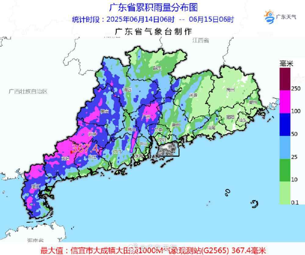 广东省气象部门观测和统计,14日6时到15日6时,湛江、茂名、阳江、云浮、肇庆、广州、江门等地的市县出现暴雨到大暴雨,局地特大暴雨降水,各市雨量最大的点包括:茂名信宜市大成镇367.4毫米、湛江廉江市长山镇258.2毫米、云浮罗定市加益镇203.7毫米、肇庆德庆县官圩镇191.7毫米、江门新会区会城街道184.3毫米。
