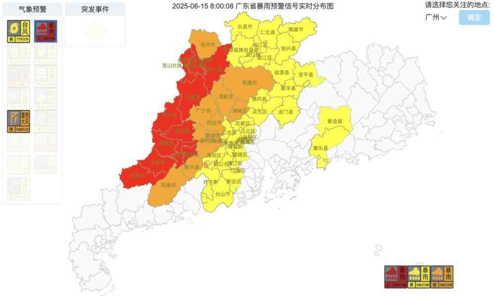 截至15日8时,广东多地仍然发布台风、暴雨、雷雨大风等“风雨预警”信号,其中茂名、云浮、肇庆、清远等市,有市县区发布了最高等级的暴雨红色预警信号。
