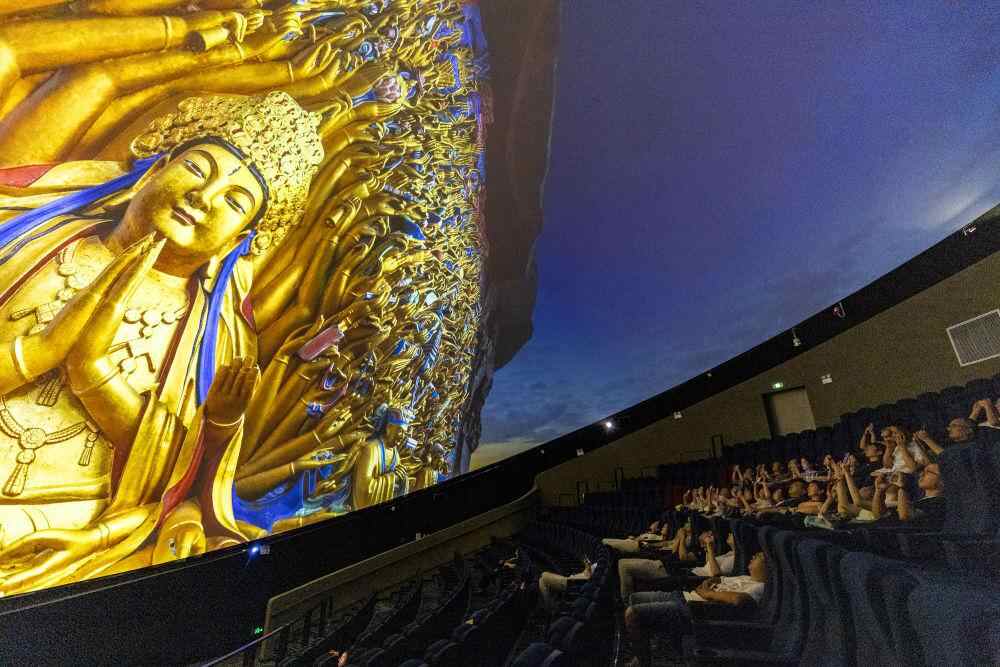 2024年9月27日,游客在重庆大足石刻景区观看8K数字球幕影片《大足石刻》。新华社记者 黄伟 摄