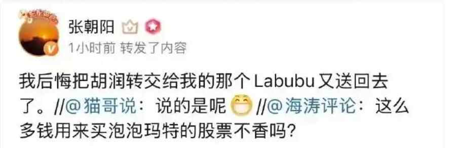 6月11日,搜狐创始人张朝阳转发Labubu拍卖新闻时表示,他此前曾将《胡润百富》创始人胡润转赠的签名版Labubu送回。张朝阳称:“后悔送回去了。”