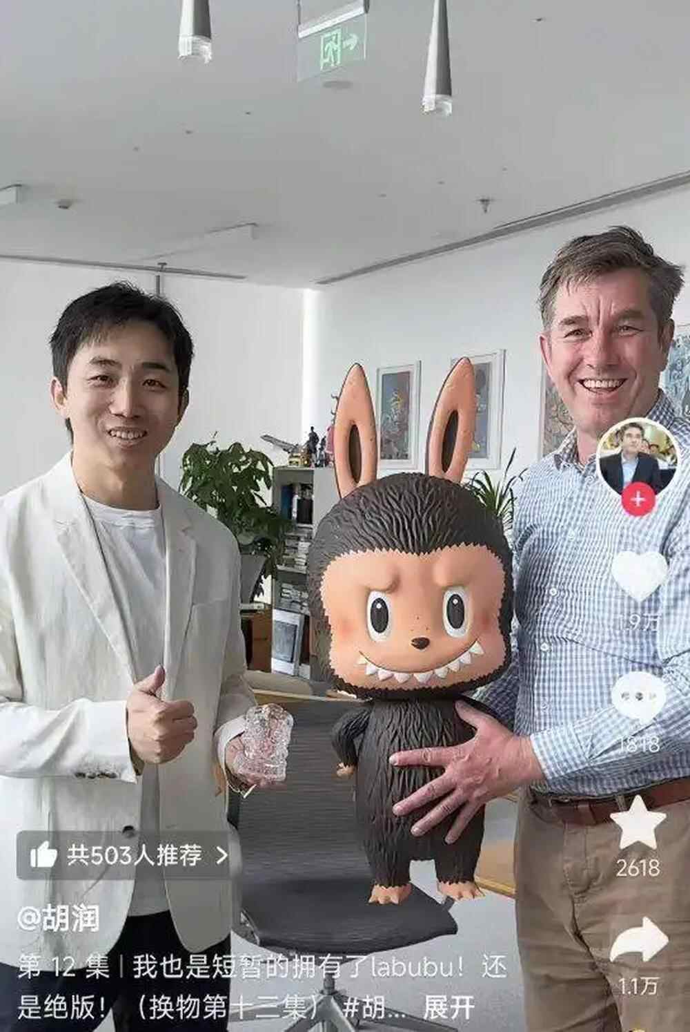 6月8日,胡润使用一枚人造蓝宝石与泡泡玛特创始人王宁交换了Labubu。 王宁称“这是公司最后一个”,同时在耳朵附上了签名。
