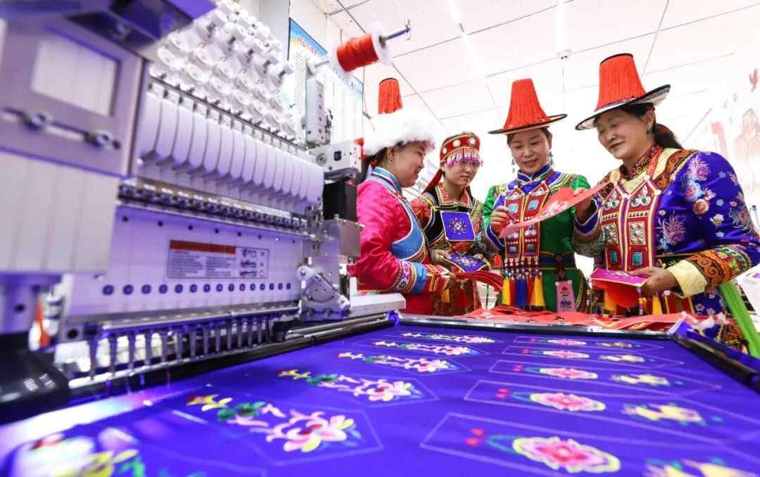 6月5日,甘肃张掖市肃南裕固族自治县非遗传承技艺大师工作室,非物质文化遗产裕固族服饰传承人在查看数字刺绣机刺绣的质量。王将摄(中经视觉)