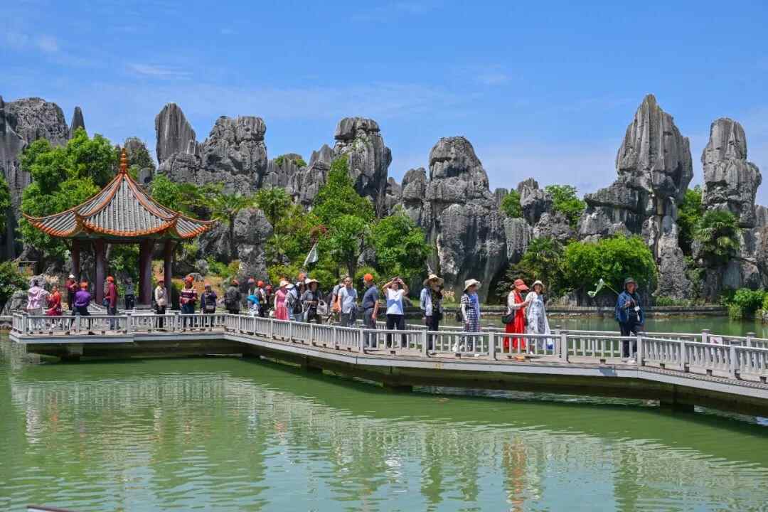 5月11日,游客在世界自然遗产云南昆明市石林景区参观游览。常奇摄(中经视觉)