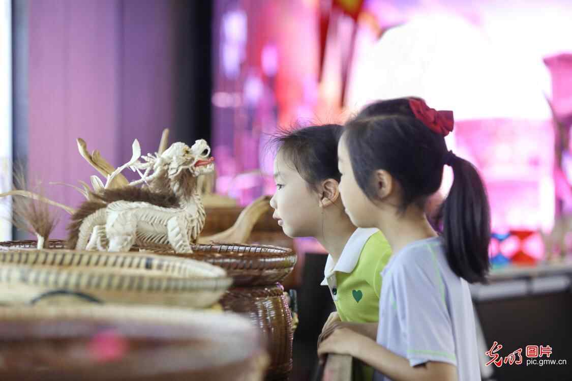 2025年6月14日,在浙江省嘉兴市秀洲区非物质文化遗产馆,小朋友正在参观非遗草编展。当日,秀洲区开展“秀游非遗·探趣匠心”系列活动,“百年非遗看秀洲摄影展”“非遗主题游园会”“非遗手工课堂”等活动,吸引了众多市民在活动中感悟非遗魅力。(金鹏摄/光明图片)