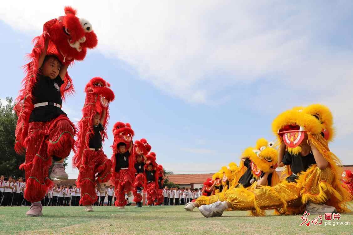 山东省滨州市博兴县店子镇第二小学组织舞狮社团的小学生向同学们表演舞狮,共同感受传统舞狮文化魅力。图为舞狮社团的小学生在向同学们表演舞狮。(陈彬摄/光明图片)