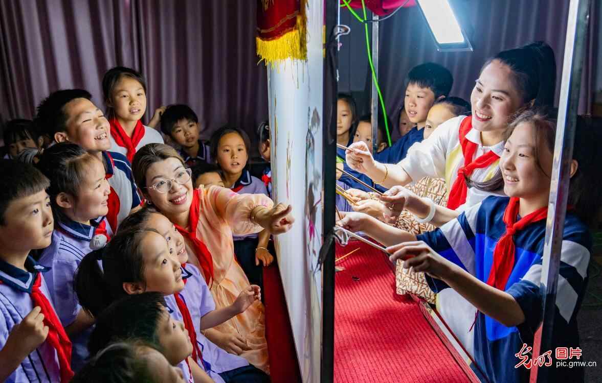 江苏省海安市教师发展中心附属小学开展“乐享皮影戏 快乐学非遗”主题活动。学生们通过制作皮影、观看皮影戏、体验皮影表演等形式,在寓教于乐中领悟传统文化的内涵和精髓,感受传统艺术的独特魅力。图为学生们在老师的指导下体验皮影戏表演。(翟伟凯摄/光明图片)