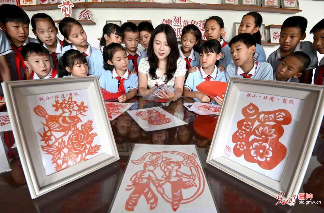 河北省邯郸市复兴区铁路小学开展“非遗进校园、文化有传承”主题活动,同学们亲身体验葫芦烙画、剪纸等非遗技艺,近距离感受中华传统文化的魅力。图为老师向学生们讲解剪纸技巧。(郝群英摄/光明图片)