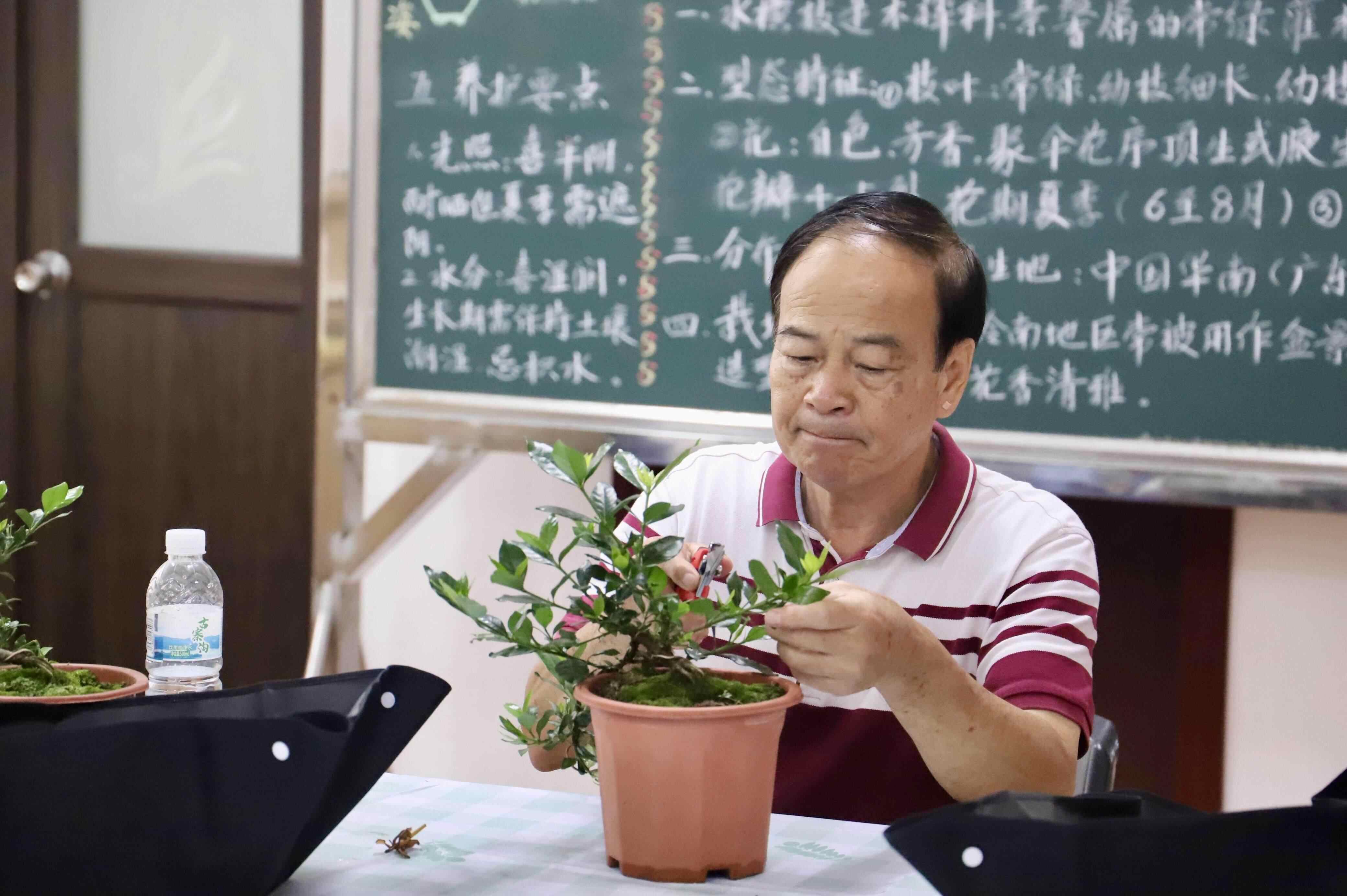 当一盆盆兼具翠绿叶片、洁白花苞与虬曲枝干的水横枝盆景成型时,有学员感叹“三分天成,七分人为”的匠心,拍照记录自己创作的“雅韵风情”。