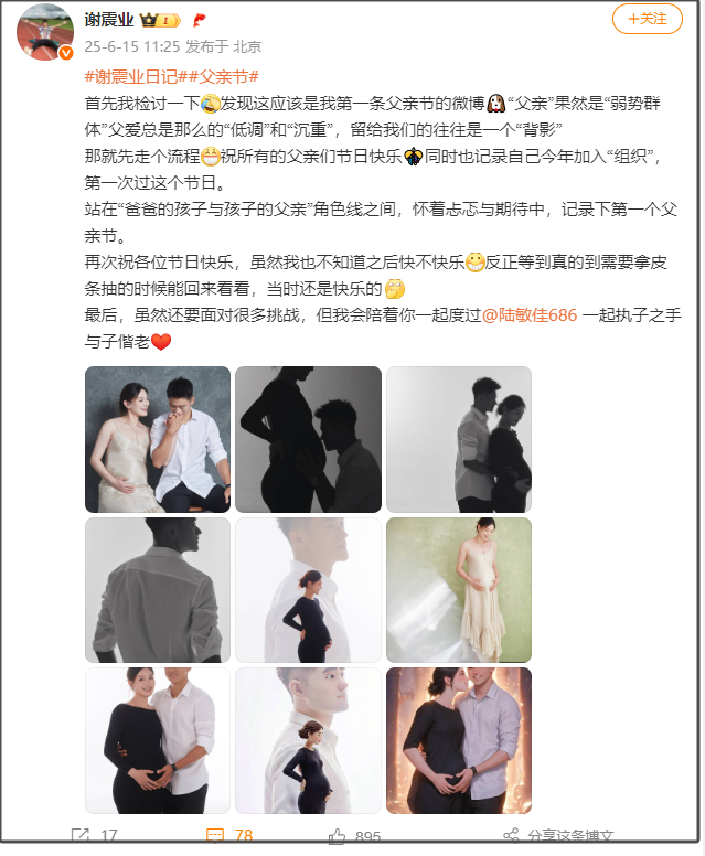 6月15日,谢震业在微博官宣当爸爸了。全文如下: