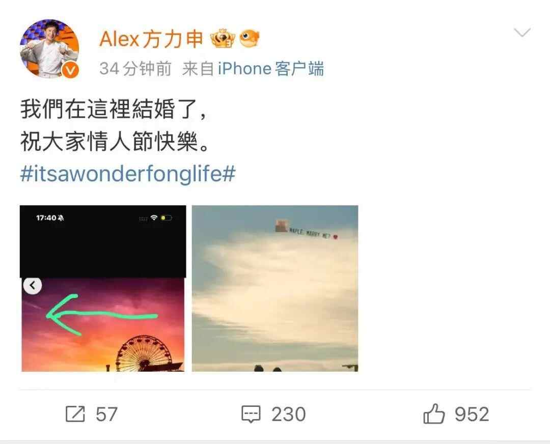 据此前报道,今年2月14日,方力申在微博晒出一张双人背影照官宣结婚喜讯。双人合照上写着:“Maple,marry me?”女方是比他小14岁的年轻艺术家叶萱,两人在2023年承认恋情。