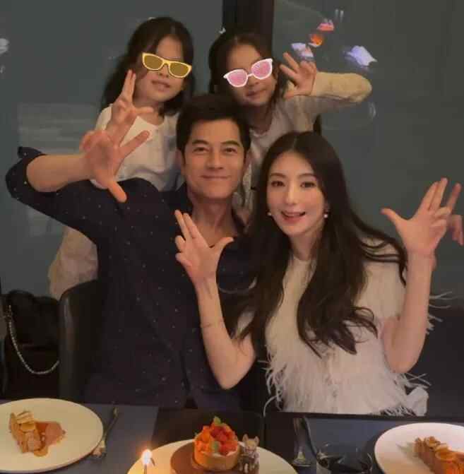 在郭富城晒出的照片中,郭富城和方媛比出手势甜蜜合影,两个女儿戴着可爱眼镜,站在爸爸妈妈的背后摆出同样的动作,甚是乖巧。