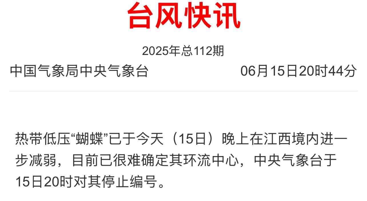 根据中央气象台观测,热带低压“蝴蝶”已于15日晚上在江西境内进一步减弱,目前已很难确定其环流中心,中央气象台于15日20时对其停止编号