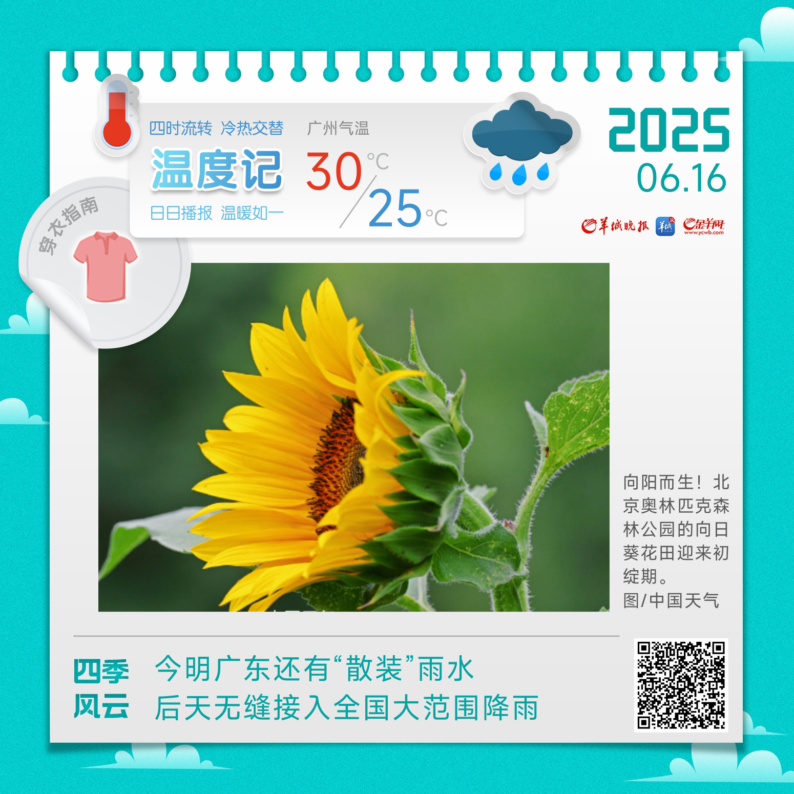 16日(周一),阴天,有大到暴雨,25℃到30℃;
