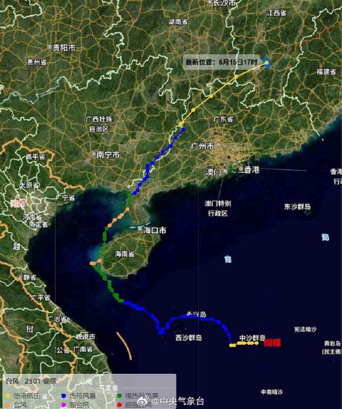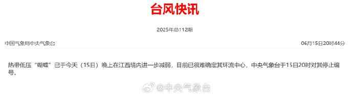 “蝴蝶”停编!昨天(6月15日)晚上,今年第1号台风“蝴蝶”在江西境内进一步减弱,目前已很难确定其环流中心,中央气象台于15日20时对其停止编号。