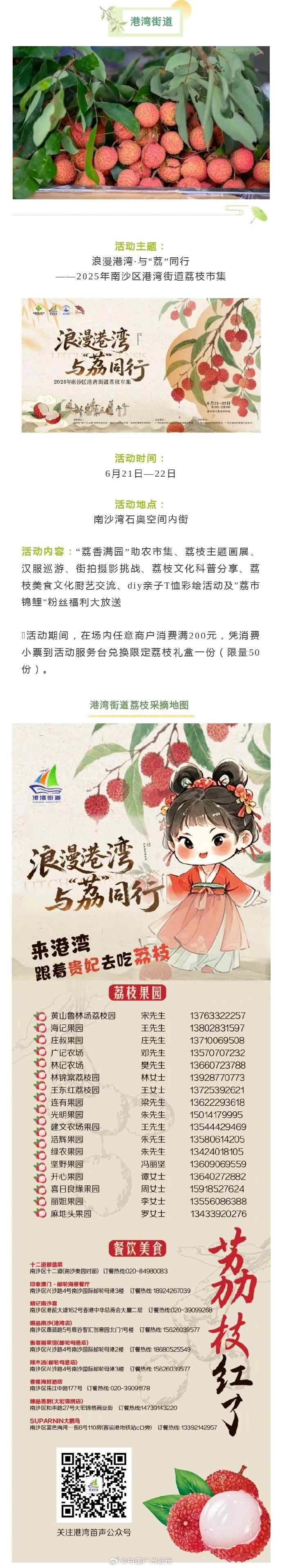喜欢吃荔枝的朋友千万不要错过啦!即日起广州南沙区南沙街道、港湾街道和黄阁镇将相继推出荔枝旅游文化节。“采、尝、游、购”一站式体验,红彤彤、圆润饱满的荔枝已经就位,等你来尝鲜!攻略都准备好了↓