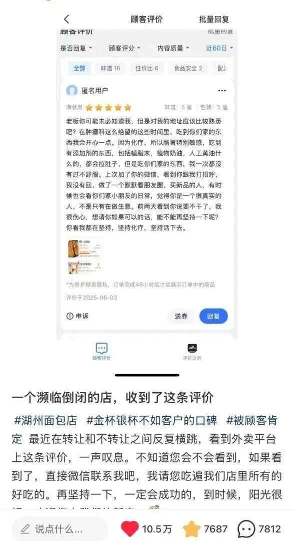 这起事件已超越个体商业行为,成为关乎社会信任的公共议题。面包店为何选择关闭账号,未出回应?不少风格相似的评论是否存在人为操纵?是否可以联系留言的癌症患者出来澄清?解开这些疑问,需要店家以清晰的证据和真诚的沟通直面质疑,需要相关部门介入,需要法律与调查给出公正结论。