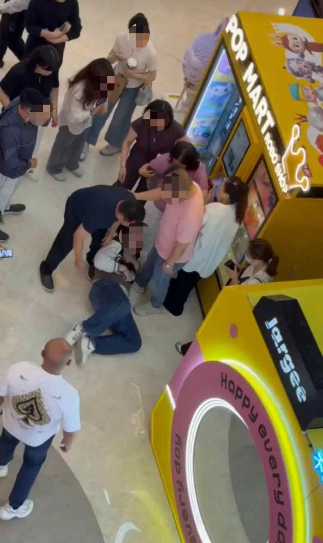 6月13日,江苏扬州。吾悦广场泡泡玛特自动贩卖机旁一行6人为抢泡泡玛特labubu殴打一名还在排队的顾客。