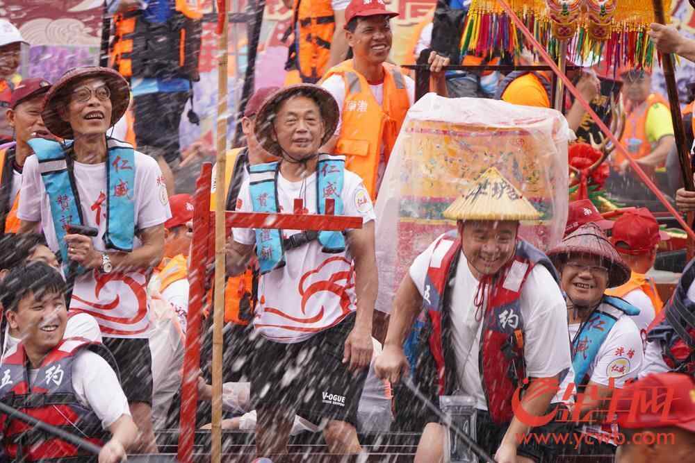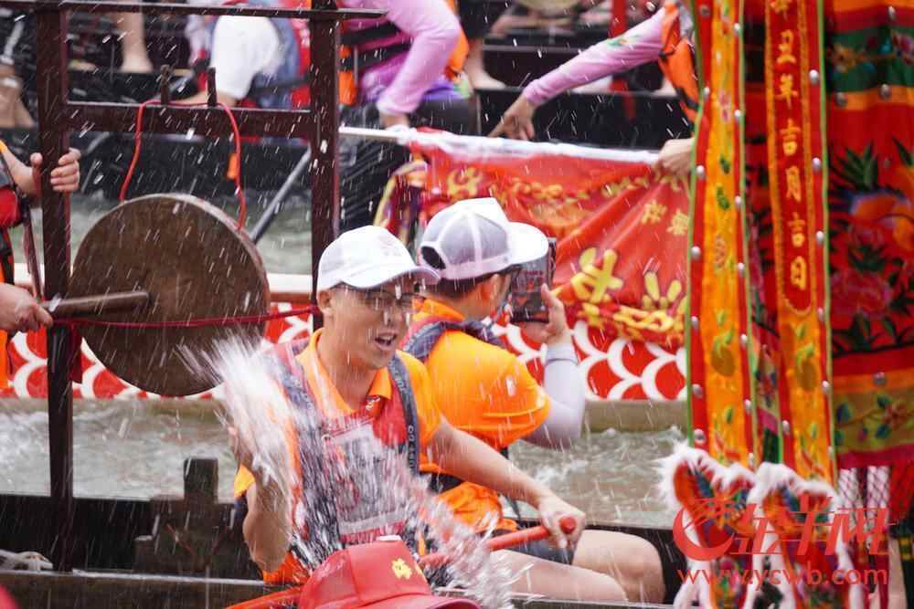 颁奖礼成,温情延续,各龙舟队伍在花地河上进行了传统的“注水礼”,正所谓,浸过龙舟水,顺风又顺水。龙舟队员们互相泼洒河水,以水为媒,传递对彼此的祝福,延续乡情友谊。