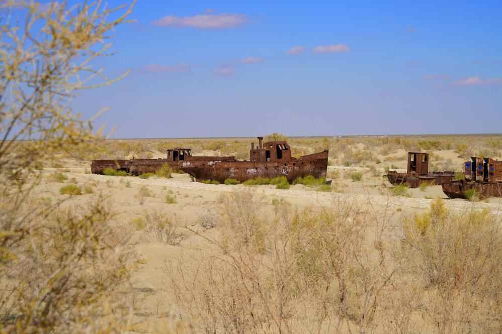这是2021年9月29日在乌兹别克斯坦穆伊纳克拍摄的因湖水干涸而搁浅在咸海的船只。新华社发(扎法尔摄)