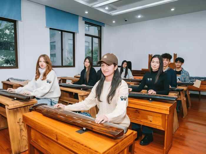 同济大学“熊猫叨叨”团队成员在国际文化交流学院学习古琴。