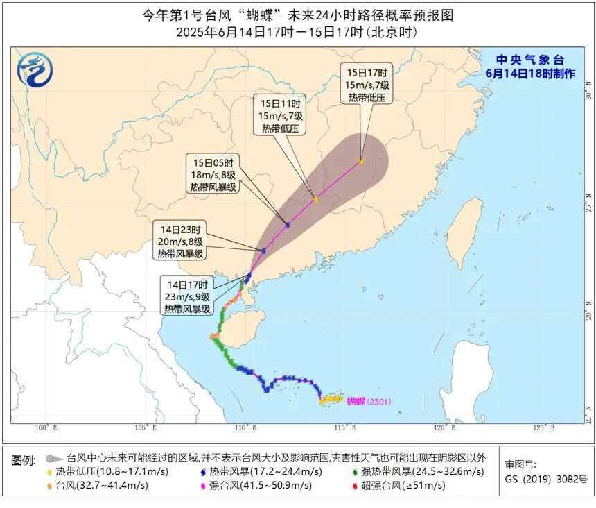根据最新预报,目前,台风“蝴蝶”位于广东省廉江市境内。预计,它将以每小时25公里左右的速度向东北方向移动,强度逐渐减弱。中央气象台今晚将台风预警降级为蓝色。
