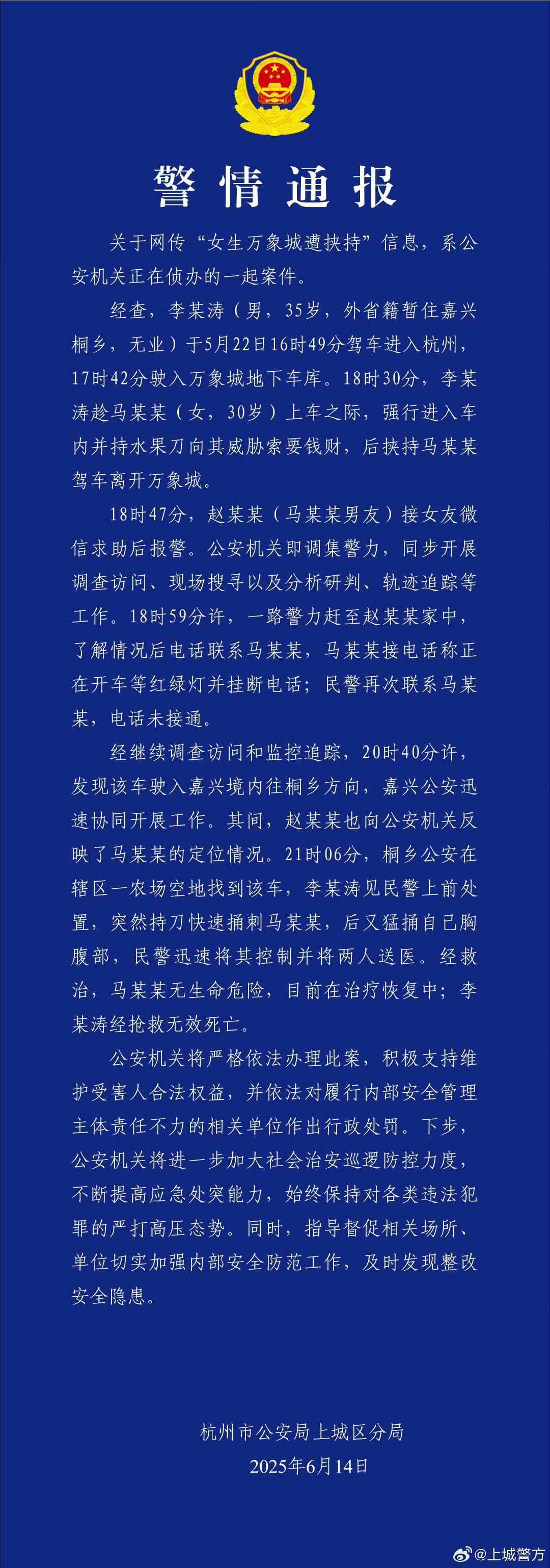 关于网传“女生万象城遭挟持”信息,系公安机关正在侦办的一起案件。