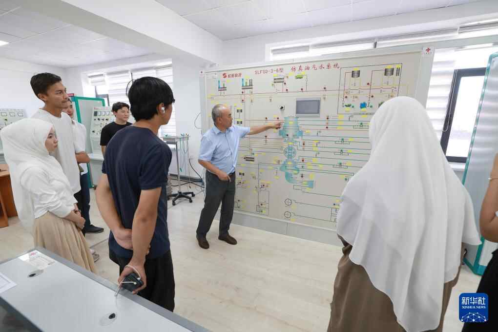 6月4日,在吉尔吉斯斯坦首都比什凯克,师生在吉尔吉斯斯坦鲁班工坊水利枢纽工程模拟演示实验室学习水电站知识。新华社发(罗曼摄)